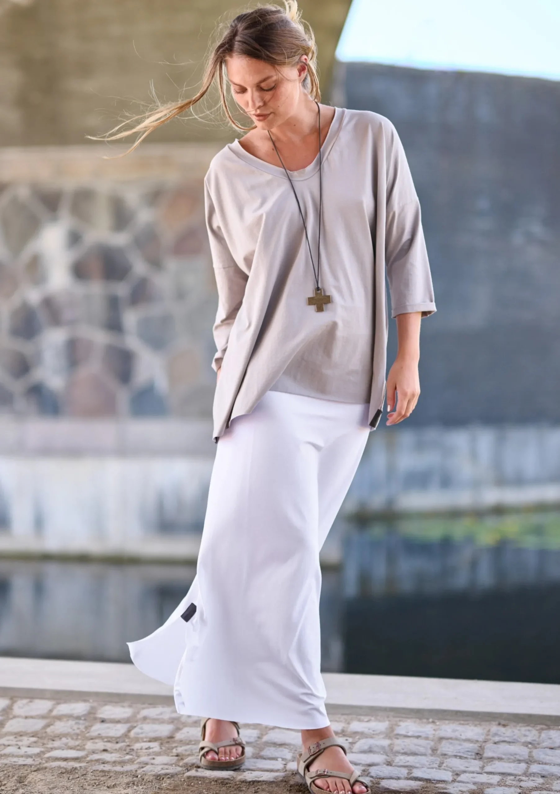 Blusen har et loose fit med trekvart lange ærmer og V-udskæring. Vores signatur kors smykke medfølger!