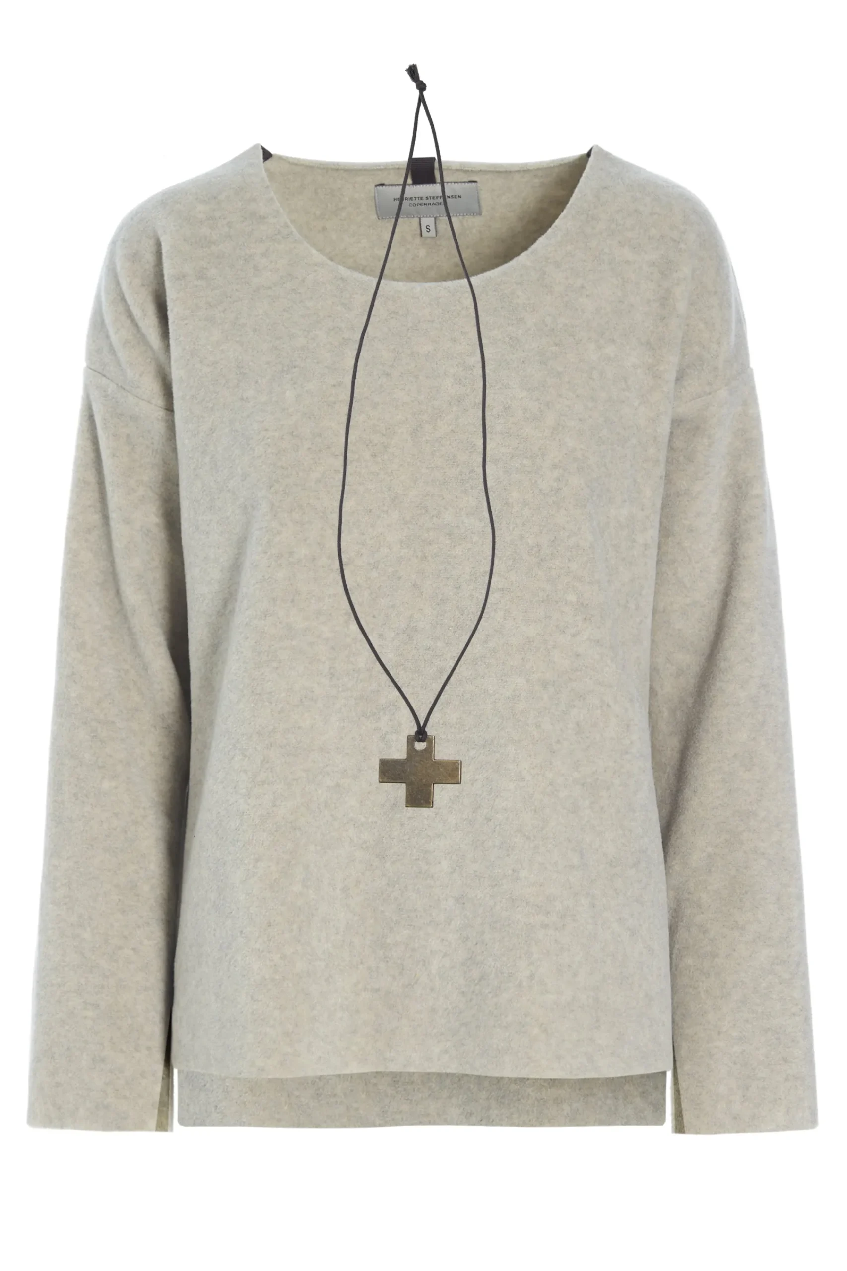 Vores halskæde er håndlavet af et messingkors i en 100% bomuldssnor. Du kan bære sweateren med eller uden halskæden – og bruge den med andre styles i din garderobe.