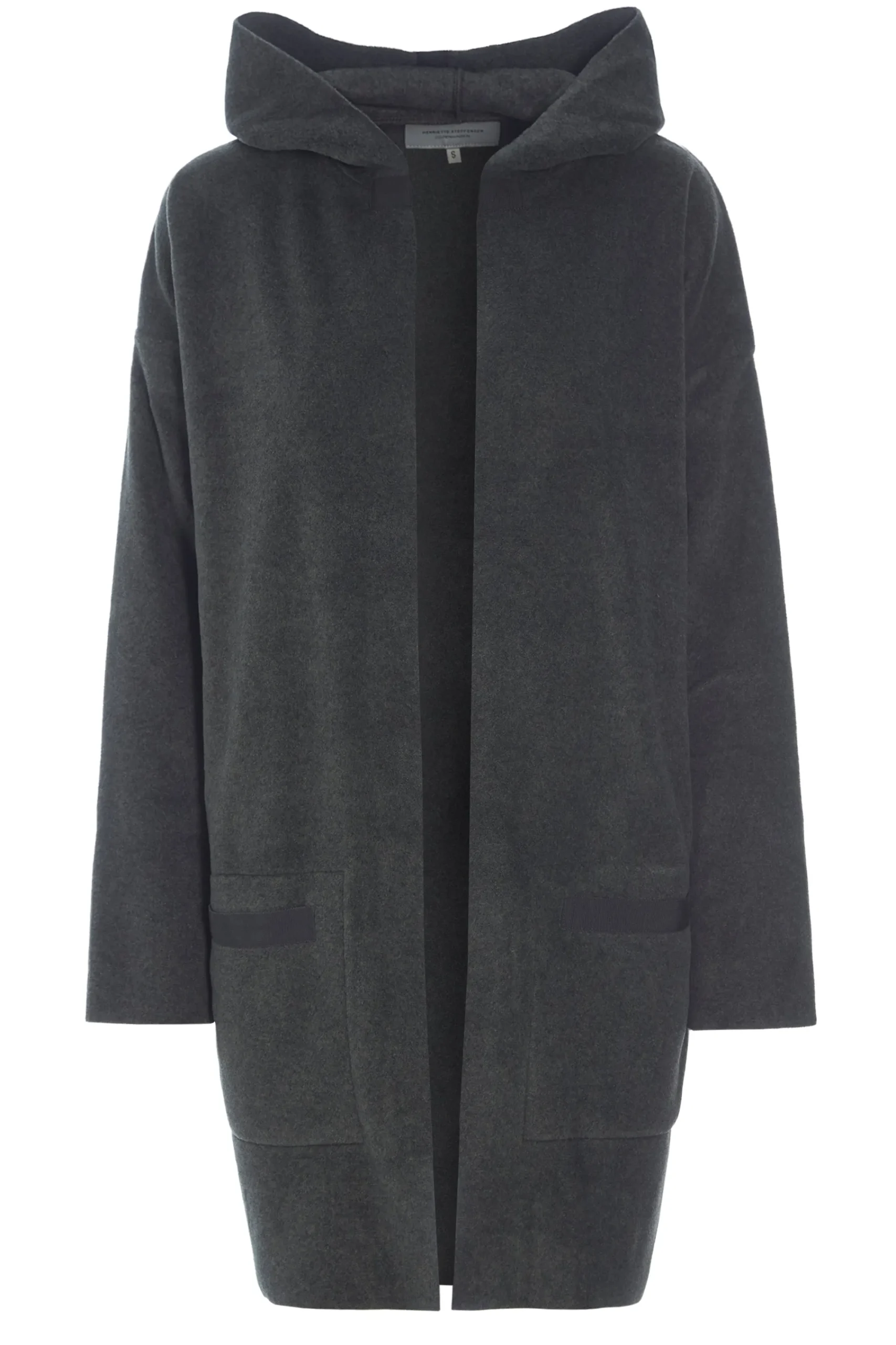 Cardigan med hætte, lommer og slidser i siderne. Perfekt at bære med et par bukser eller nederdel og en fin T-shirt. Cardiganen er åben, hvilket giver den et sporty look, men et bælte kan tilføjes for en mere feminin silhuet.