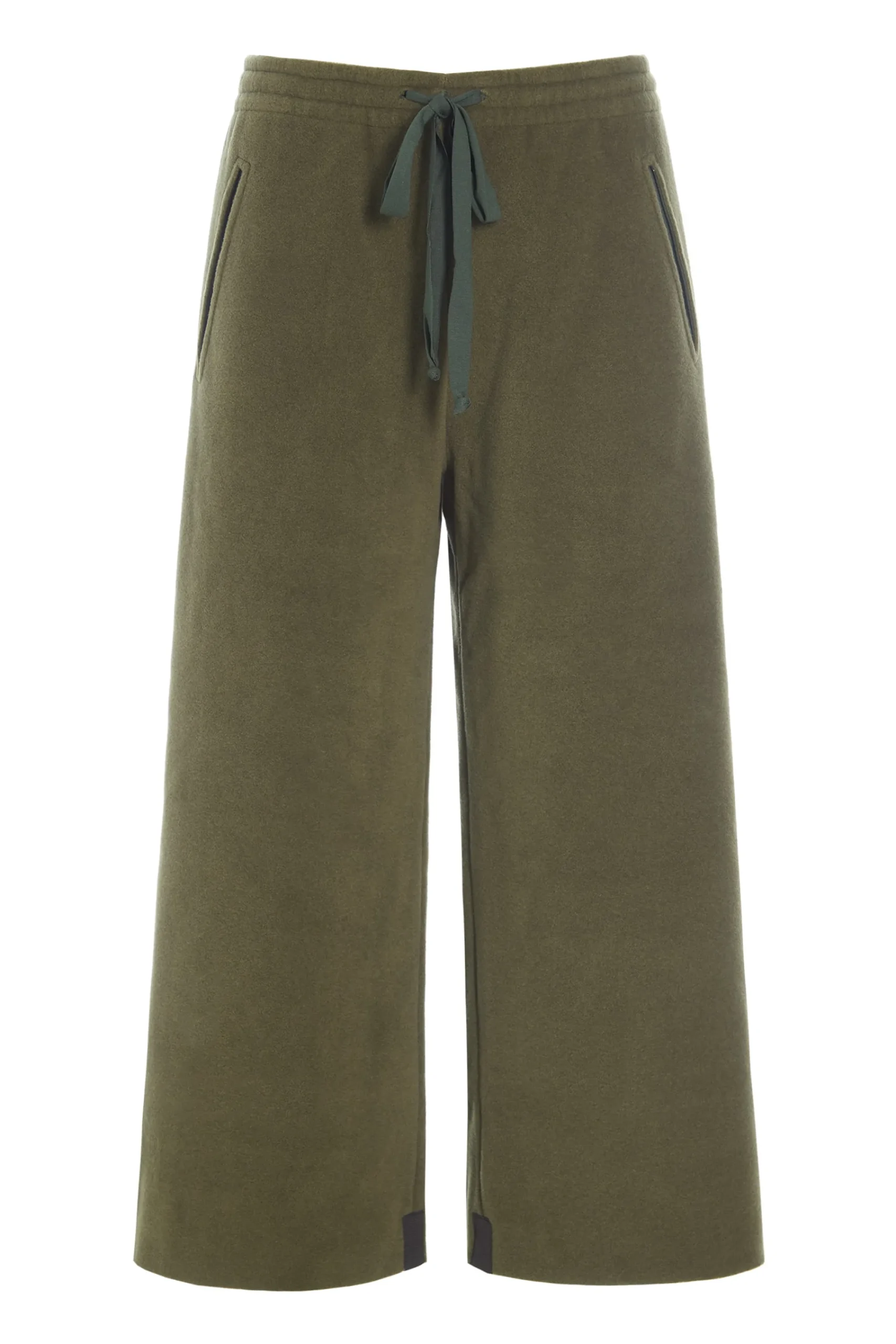 Fleecebukser med vidde ben i længde til under knæene. Bukserne har lommer i siderne og bindes foran.