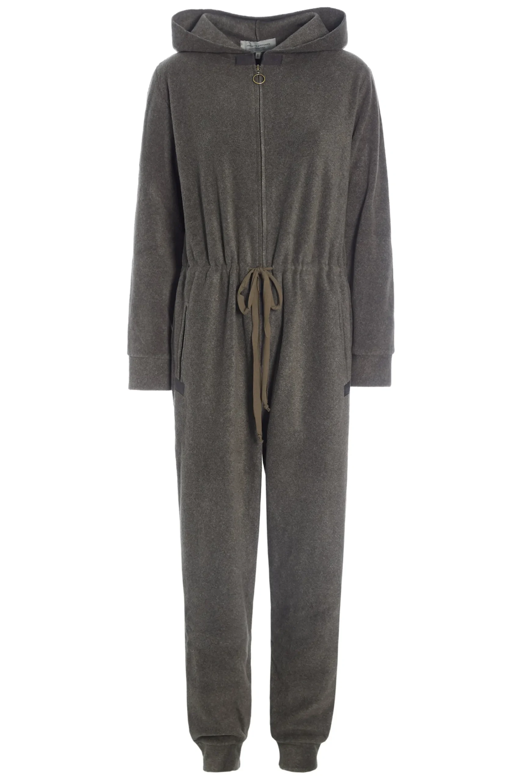 Rummelig og komfortabel jumpsuit med messing lynlås, bindebånd i taljen, hætte og lommer. Nyd den bløde følelse i denne heldragt. Perfekt at putte sig i efter en tur i det kolde hav!