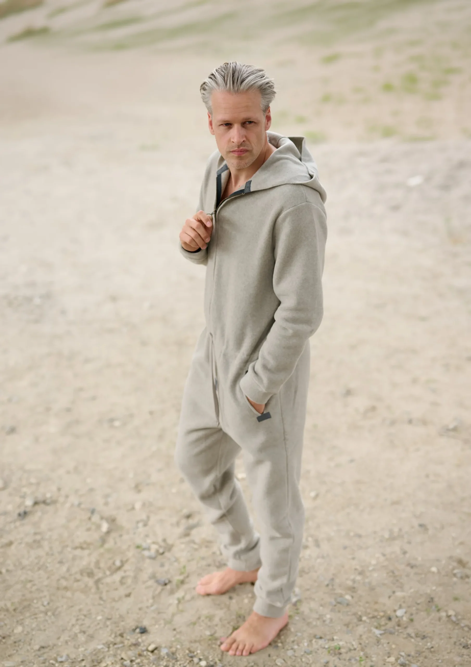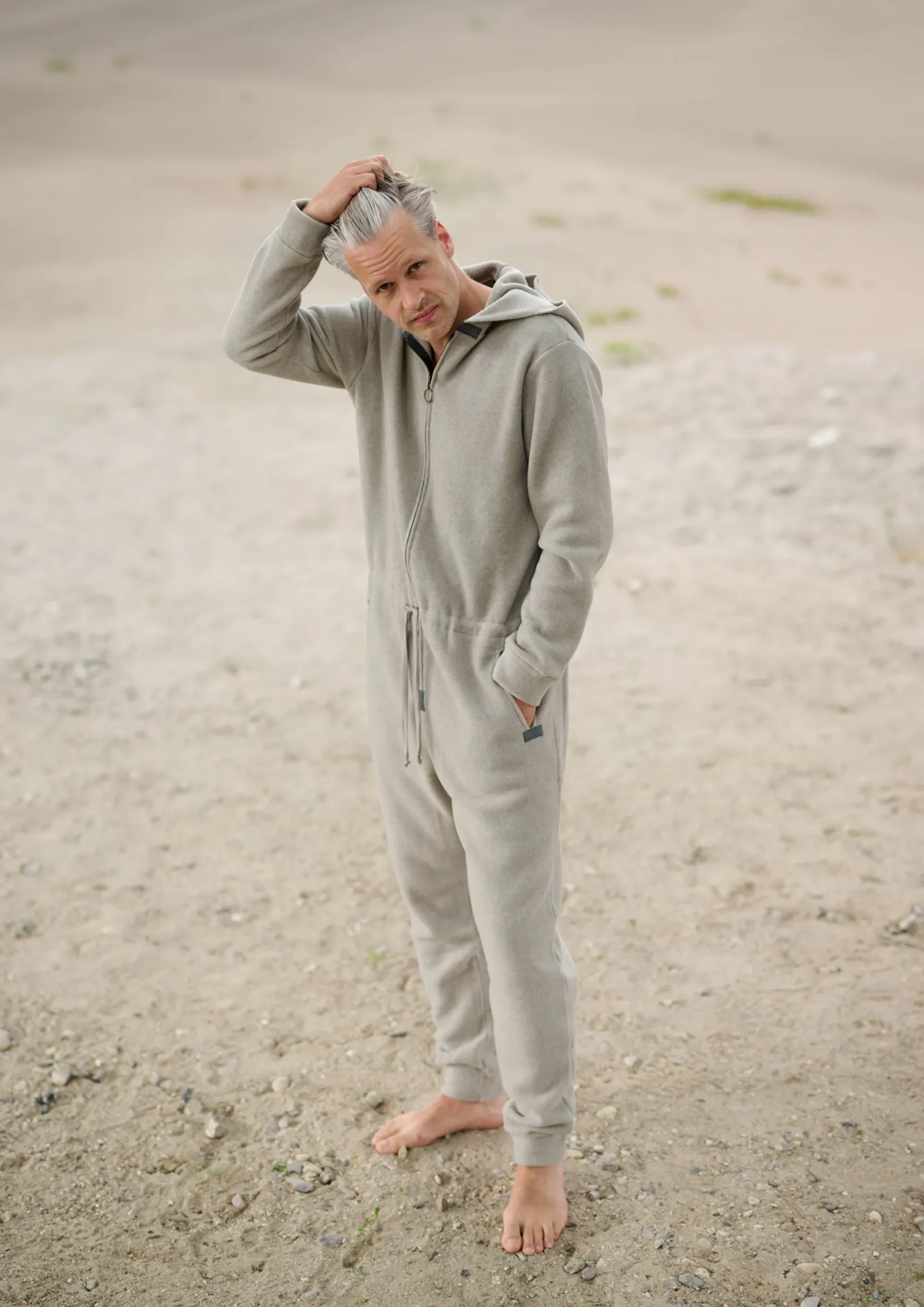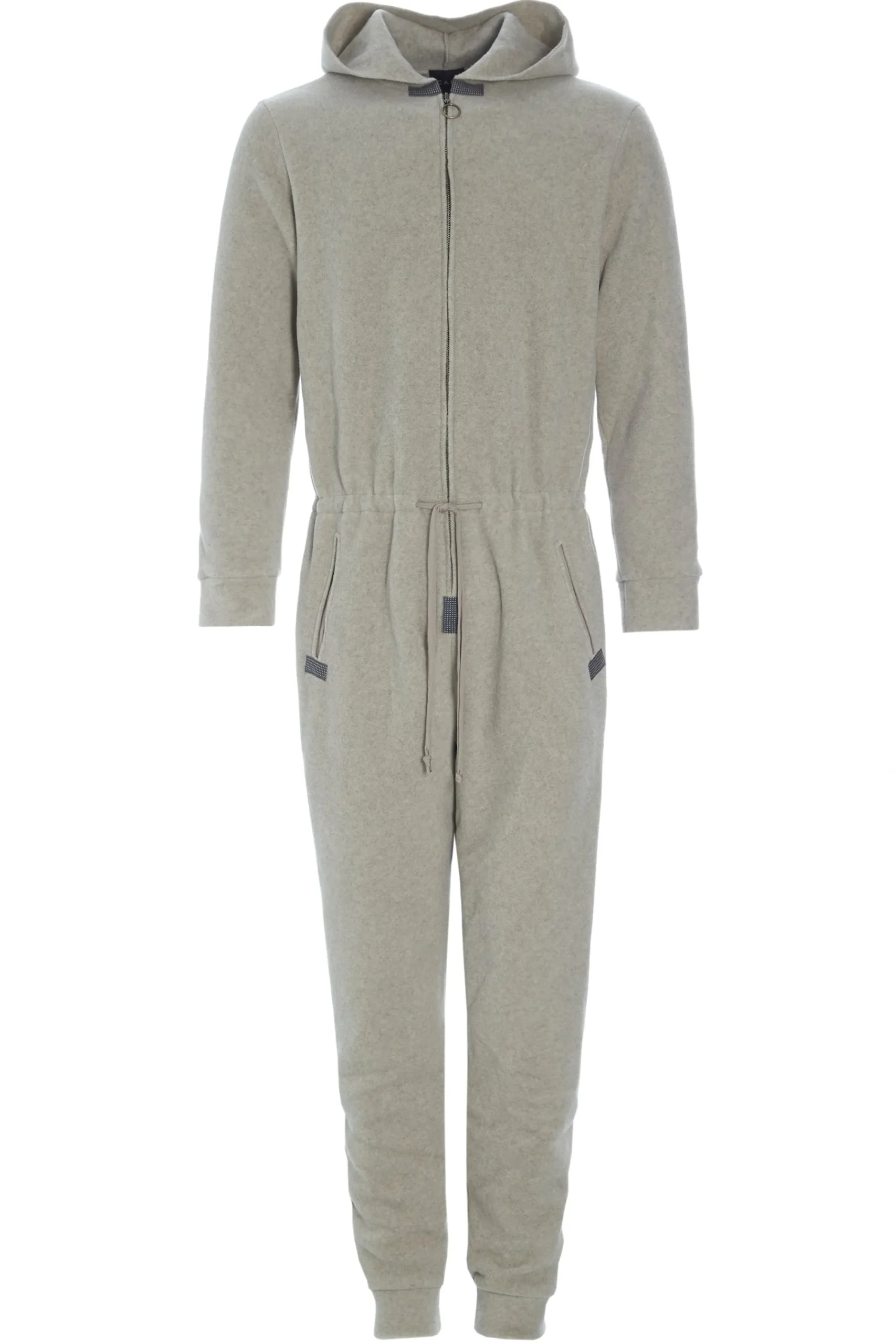 Rummelig og komfortabel jumpsuit med messinglynlås, bindebånd i taljen, hætte og lommer. Nyd den bløde følelse i denne heldragt. Perfekt at putte sig i efter en tur i det kolde hav!