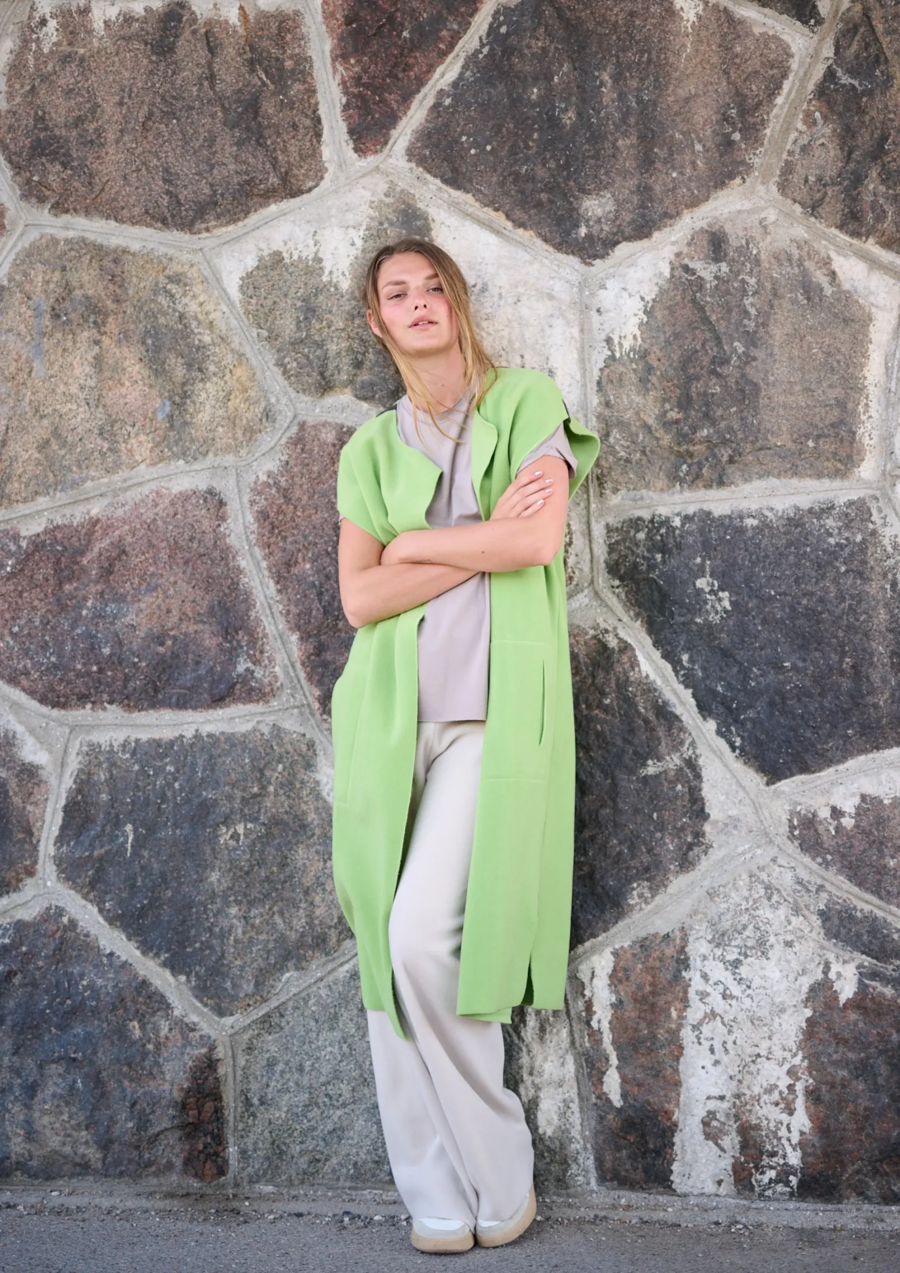 Lang vest i løs pasform med store lommer, sideslidser og store ærmegab, som gør det muligt at style med en trøje ovenpå.
