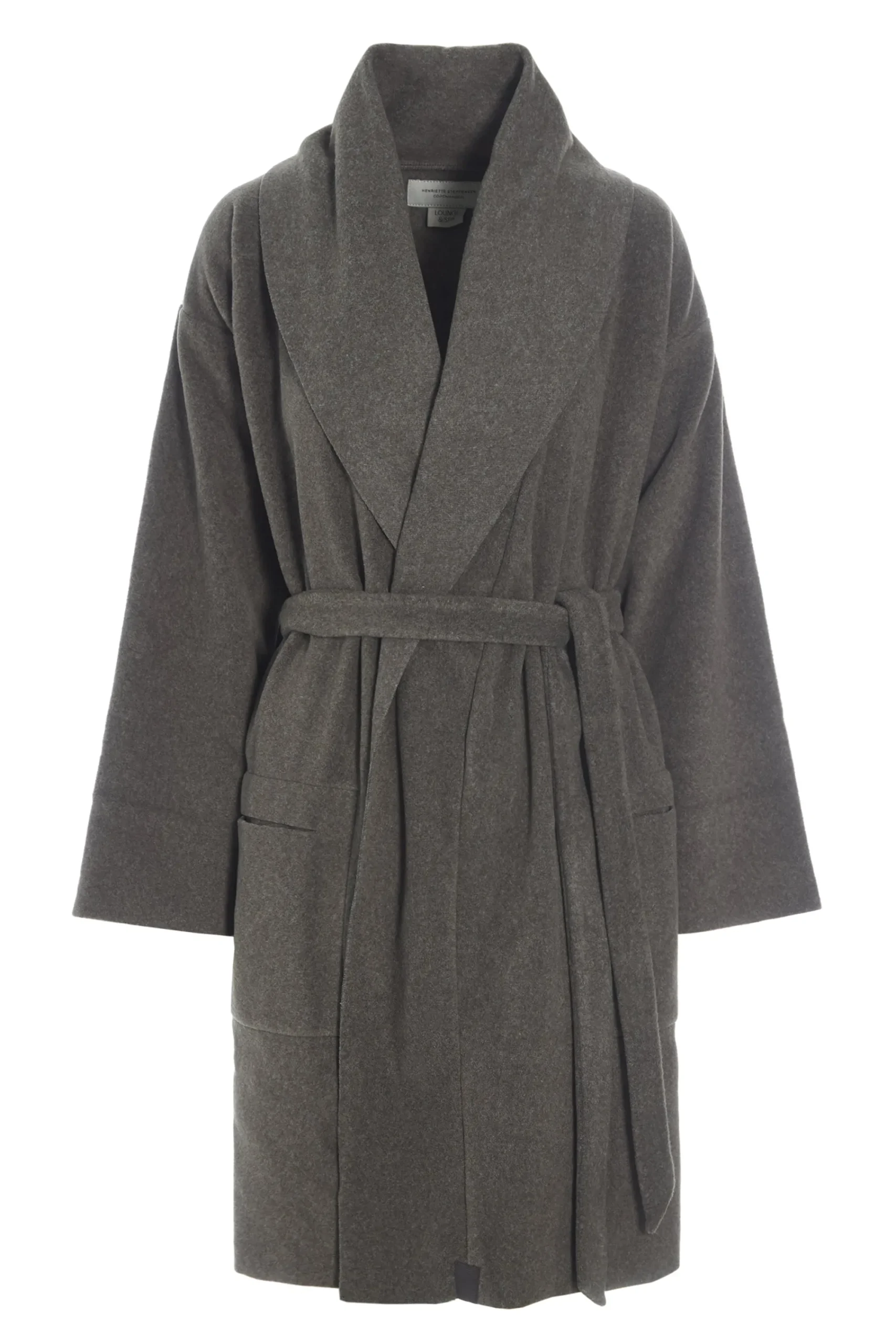 En størrelse morgenkåbe, badekåbe, housecoat denne style har mange navne. Den er varm, næsten vægtløst, hyggelig med høj hals, lommer og en bælte til lukning. Hvis du kan lide at hoppe i koldt vand – vil du elske at have denne style liggende klar til dig. Vælg din yndlingsfarve og nyd den meget bløde følelse.