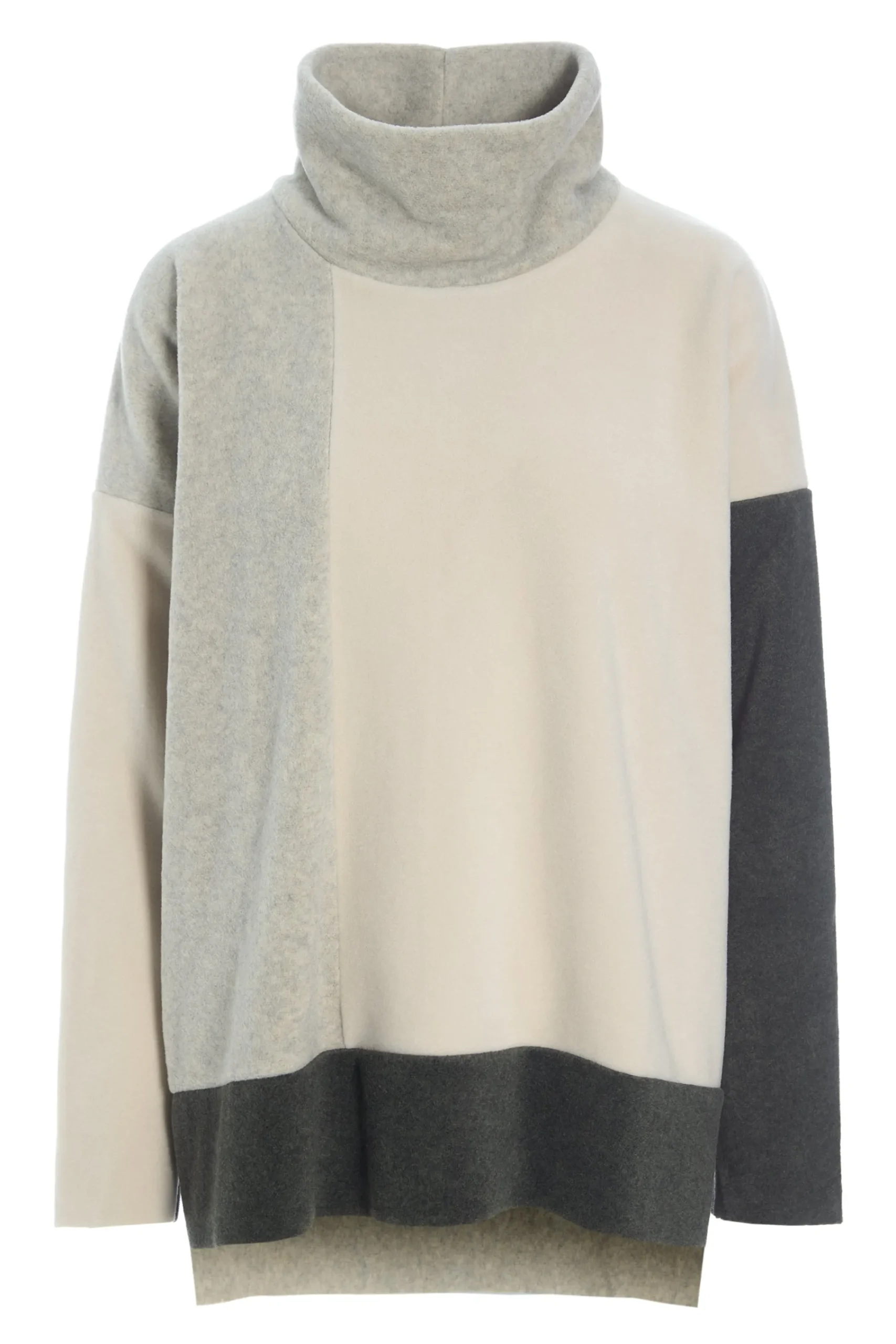 Multifarvet kasseformet sweater med høj hals. Sweateren er længere bagpå og har slidser i siderne. Som en del af vores PATCH sortiment kommer denne sweater i forskellige kombinationer af vores klassiske, bløde farver.