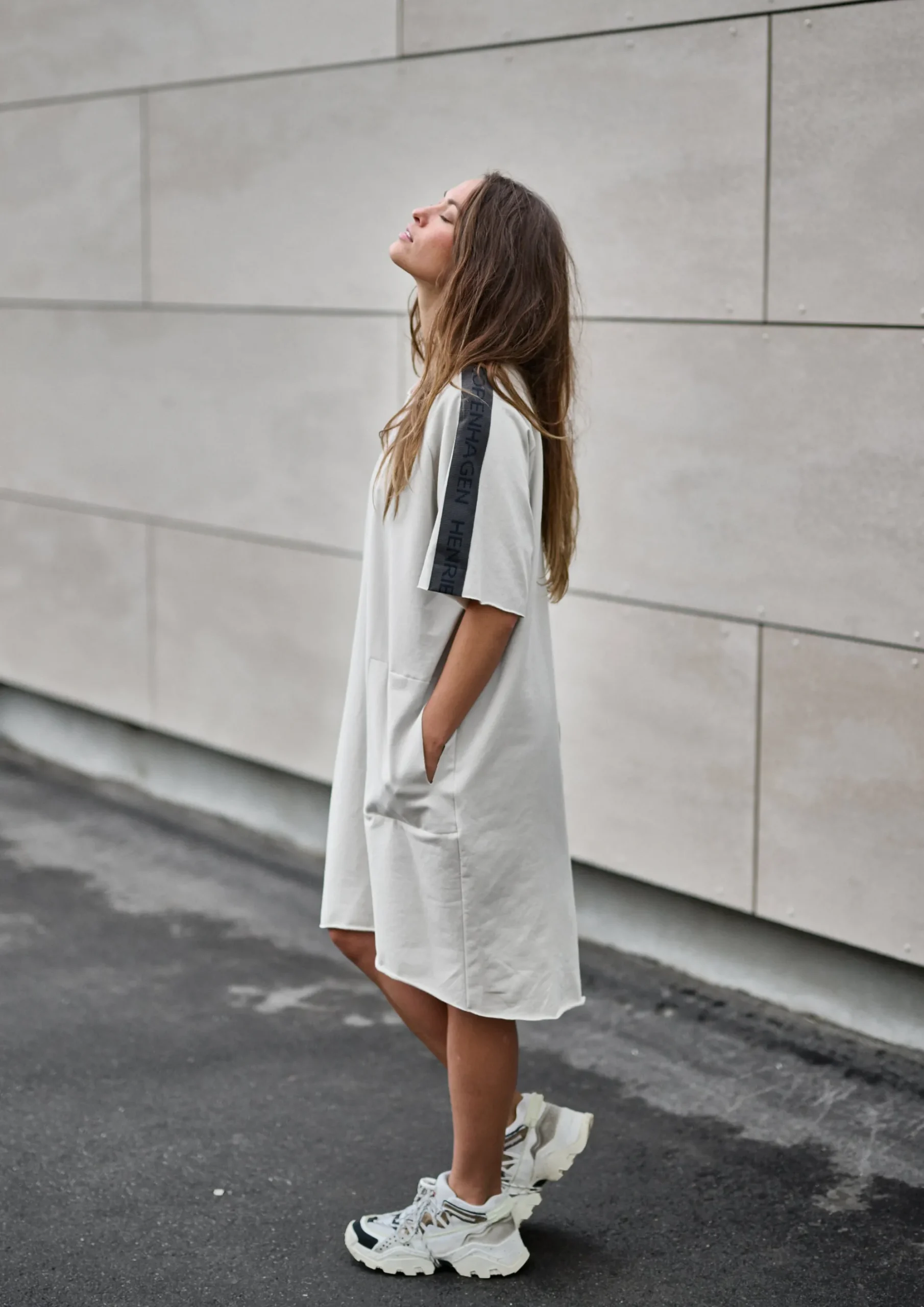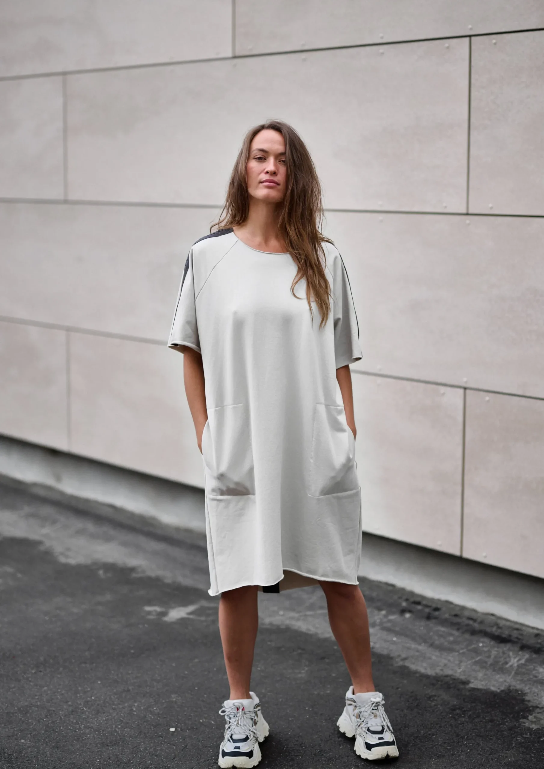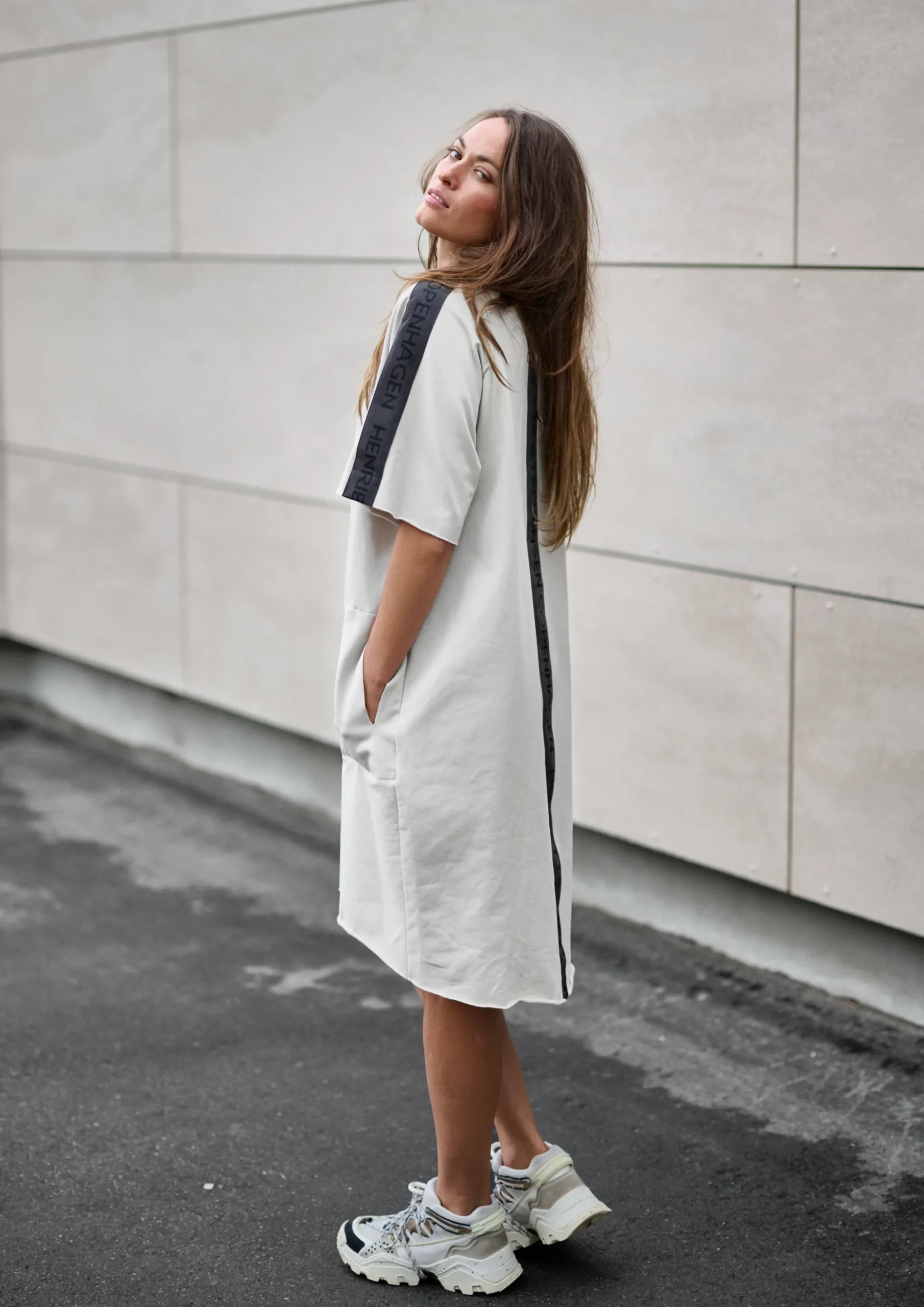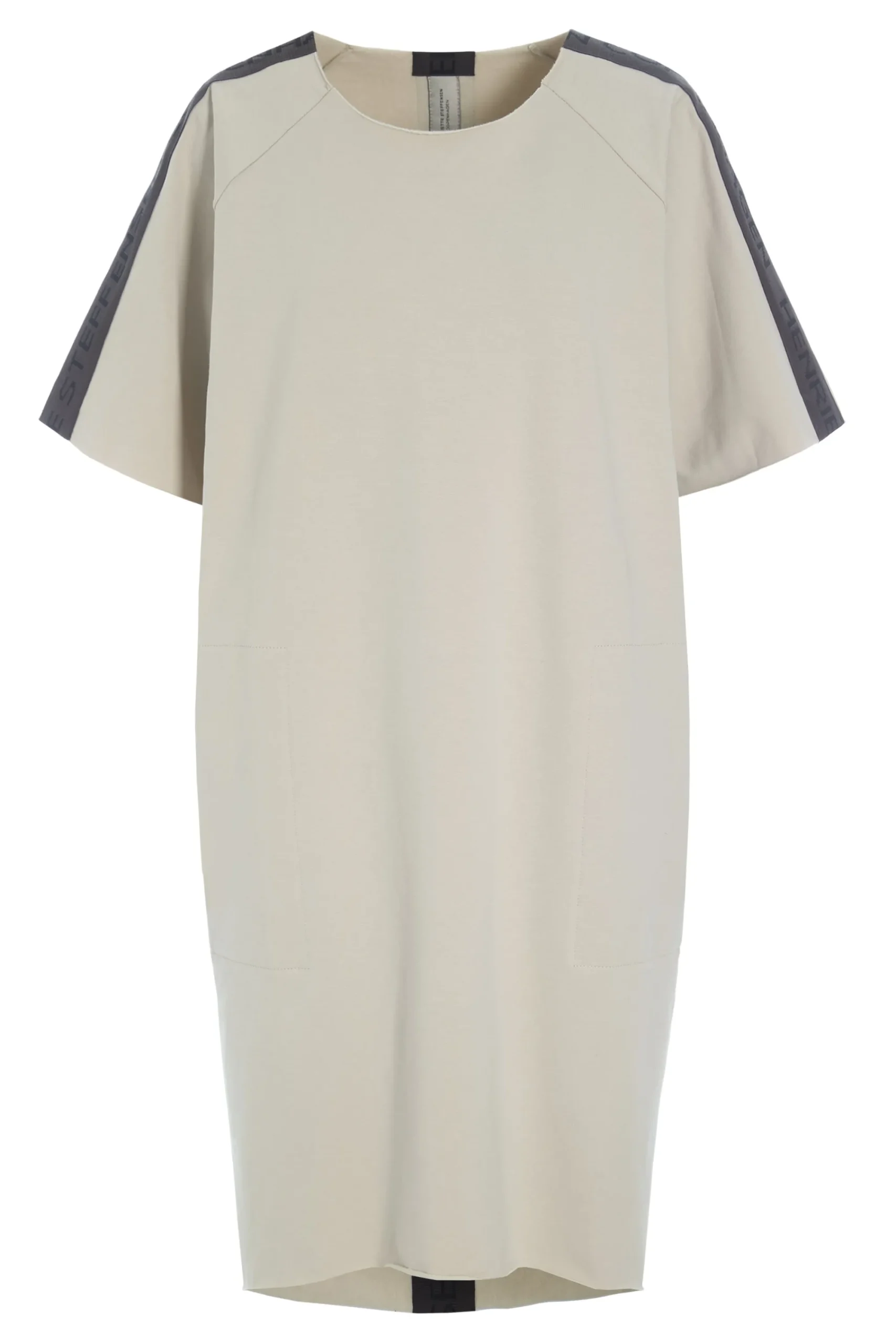 Kasseformet kjole med logo-bånd på bagsiden. De rå kanter giver en flot kontrast til kjolen. Denne kjole vil være et must-have i din garderobe. Det bliver din go-to kjole, når du ikke ved, hvad du skal have på. Brug den på kontoret, når du slapper af, eller style den med dit yndlingssmykke, for når du skal klæde dig pænt på.