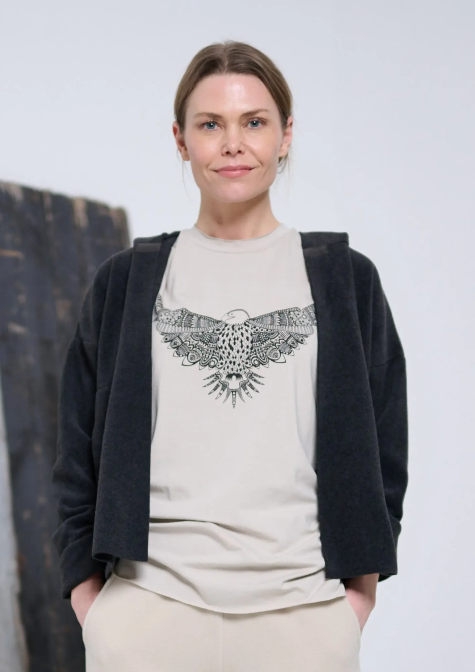 Onesize T-shirt med løs rund hals og ørne print. Denne style passer godt til M, L, XL – hvis du bruger XS -S og ønsker oversize, er den også perfekt! Brug den med jeans og blazer eller under din favorit fleece.
