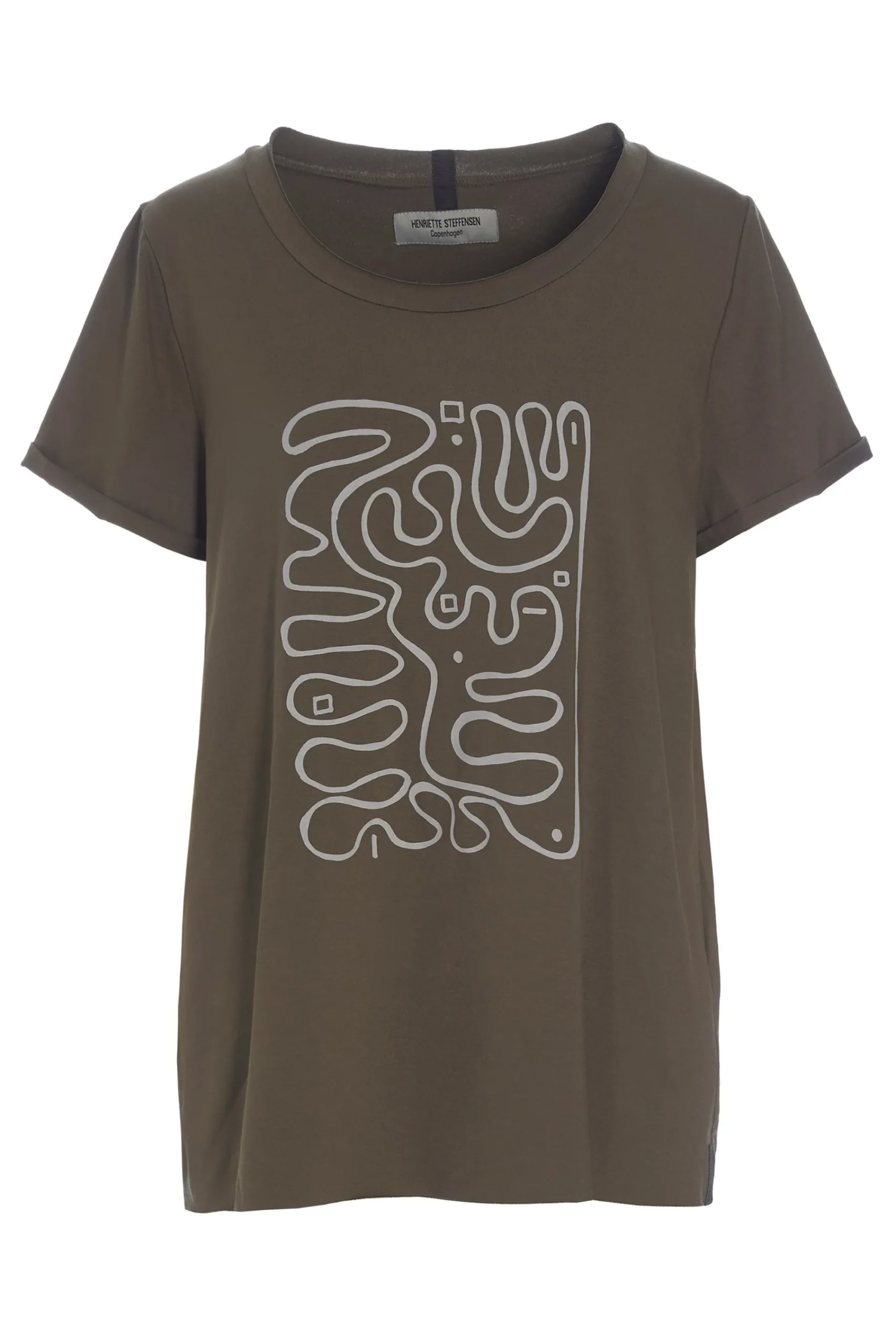 T-shirt med lidt dybere rund hals og print. Denne onesize style passer godt til str. M,L,XL – hvis du er til oversize er den perfekt til dig der bruger XS & S! Mix med jeans og blazer eller under din favorit fleece cardigan.