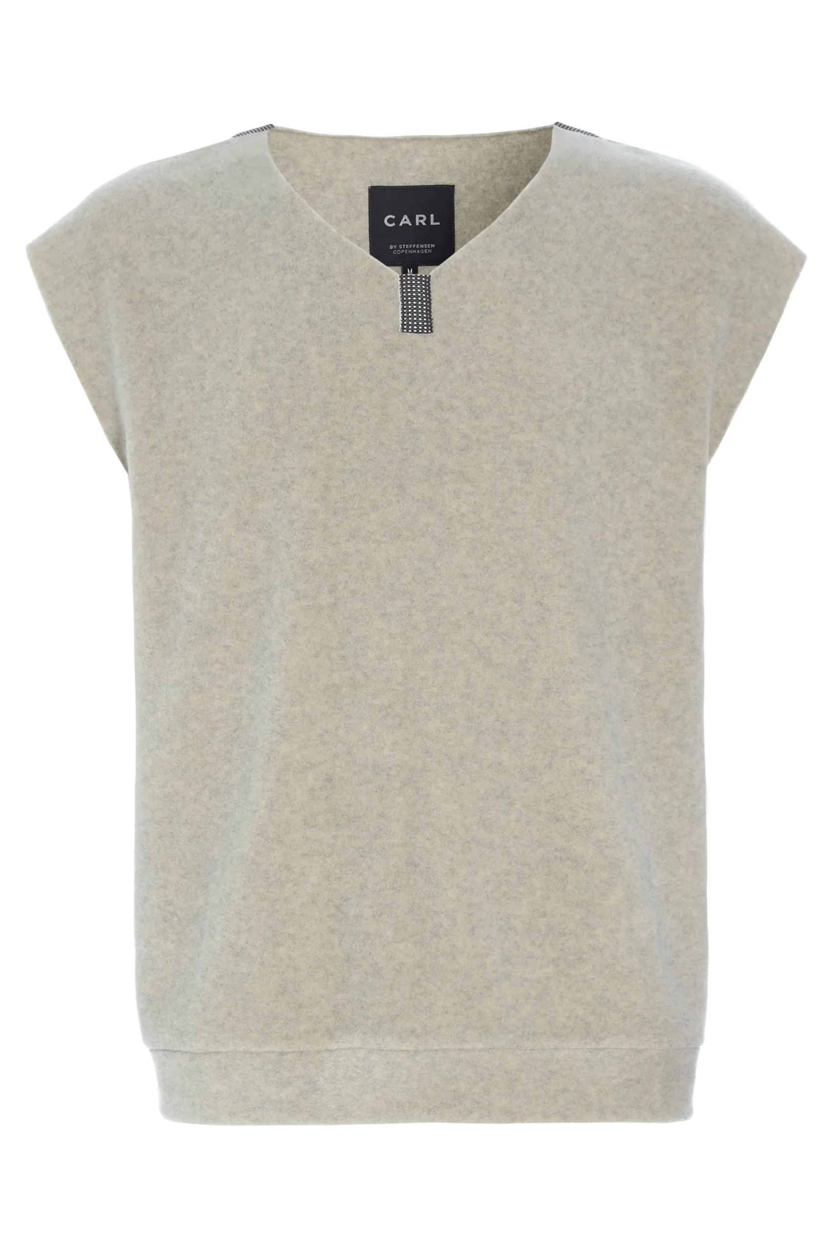 Denne klassiske, ærmeløse pullover har en V-udskæring, grosgrainbånd og en ribkant omkring taljen. Vores specielle kvalitet af fleecemateriale gør denne pullover blød, luftig og nem at rense.