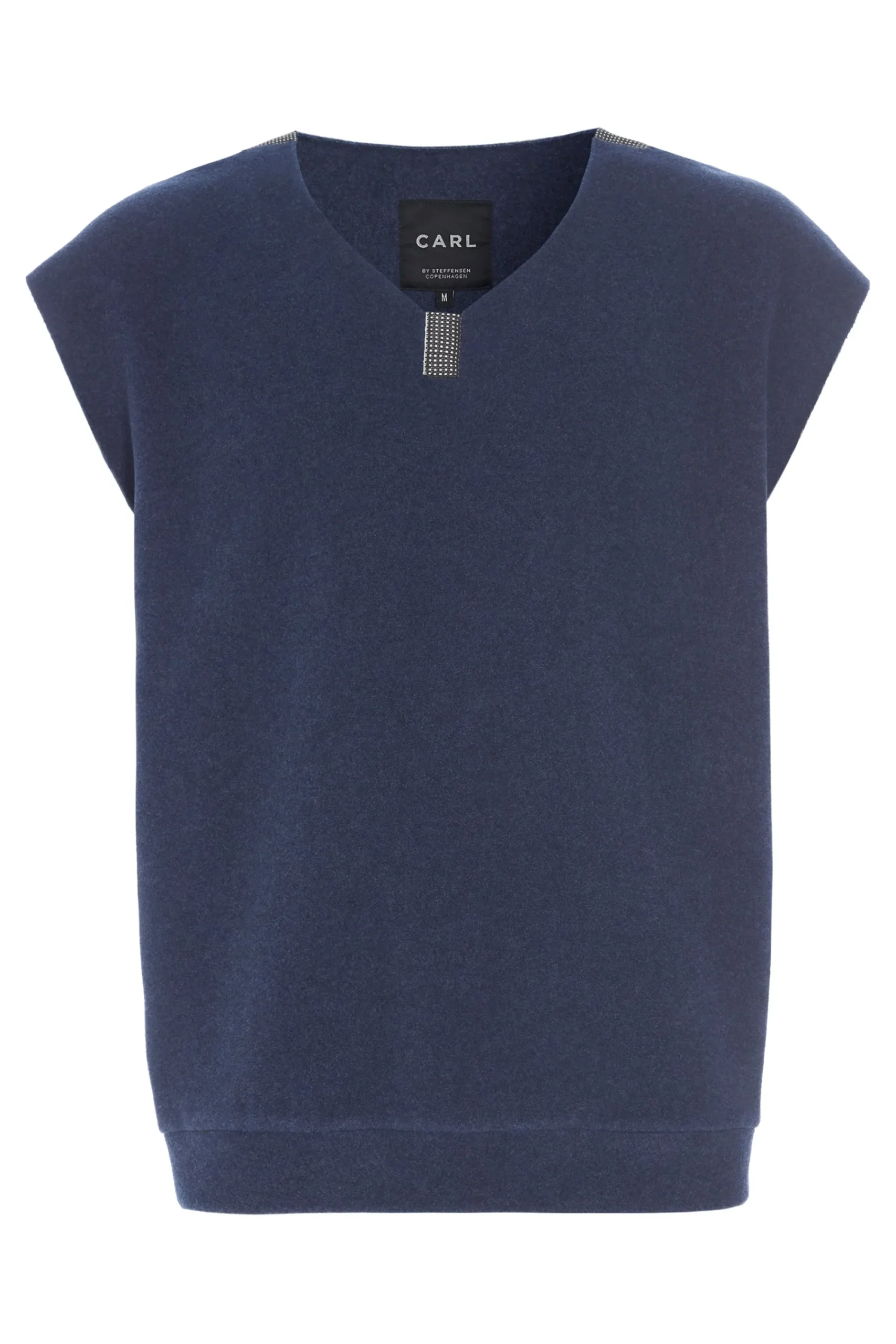 Denne klassiske, ærmeløse pullover har en V-udskæring, grosgrainbånd og en ribkant omkring taljen. Vores specielle kvalitet af fleecemateriale gør denne pullover blød, luftig og nem at rense.