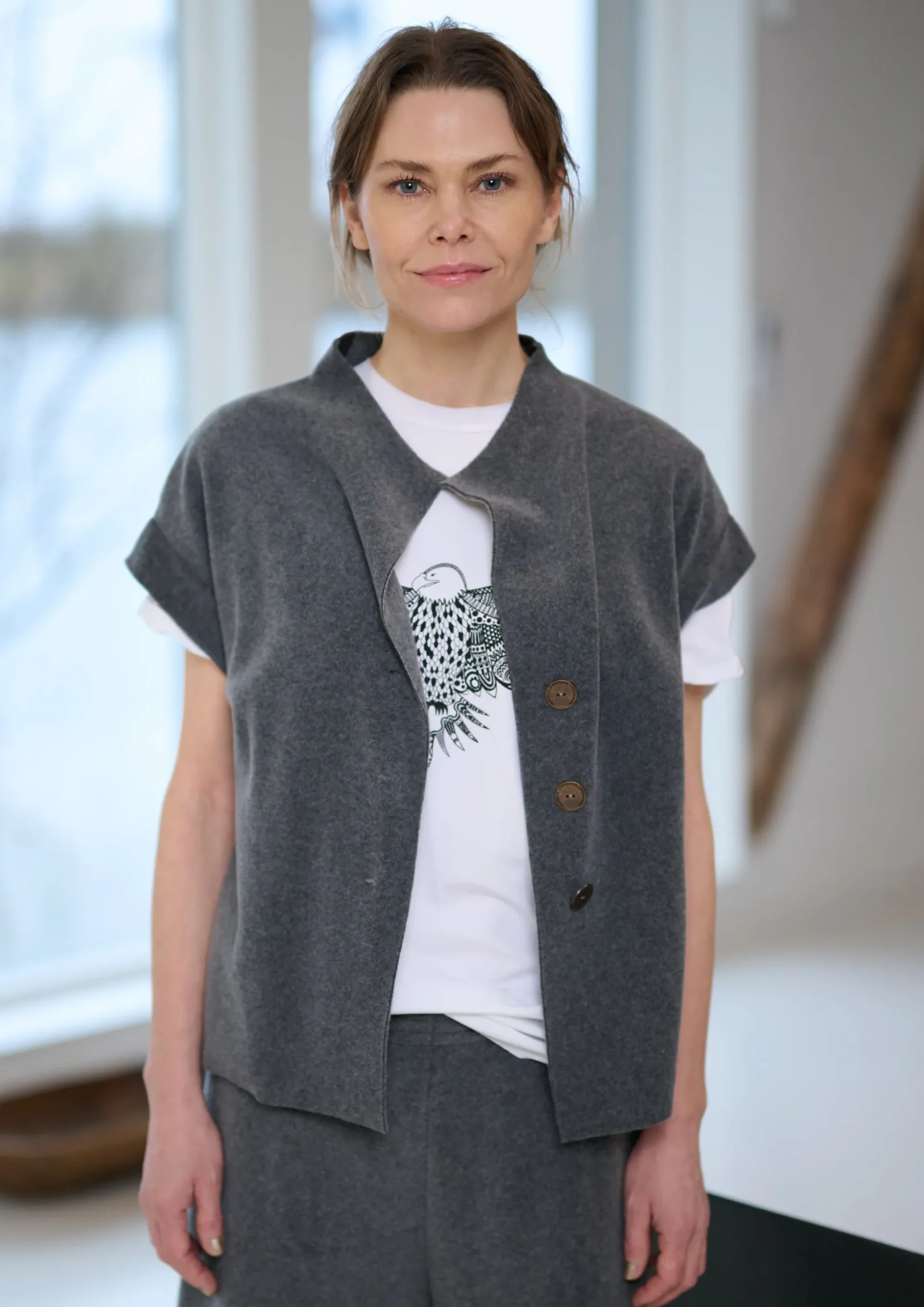 Denne bløde vest er perfekt til mellem-årstiderne for at holde varmen. Bær den over en fin skjorte og luk den med et bælte, for et mere feminint look. Du kan vælge mellem forskellige farver, og den kasseformede silhuet gør denne vest velegnet til både afslappet og hverdagsbrug.
