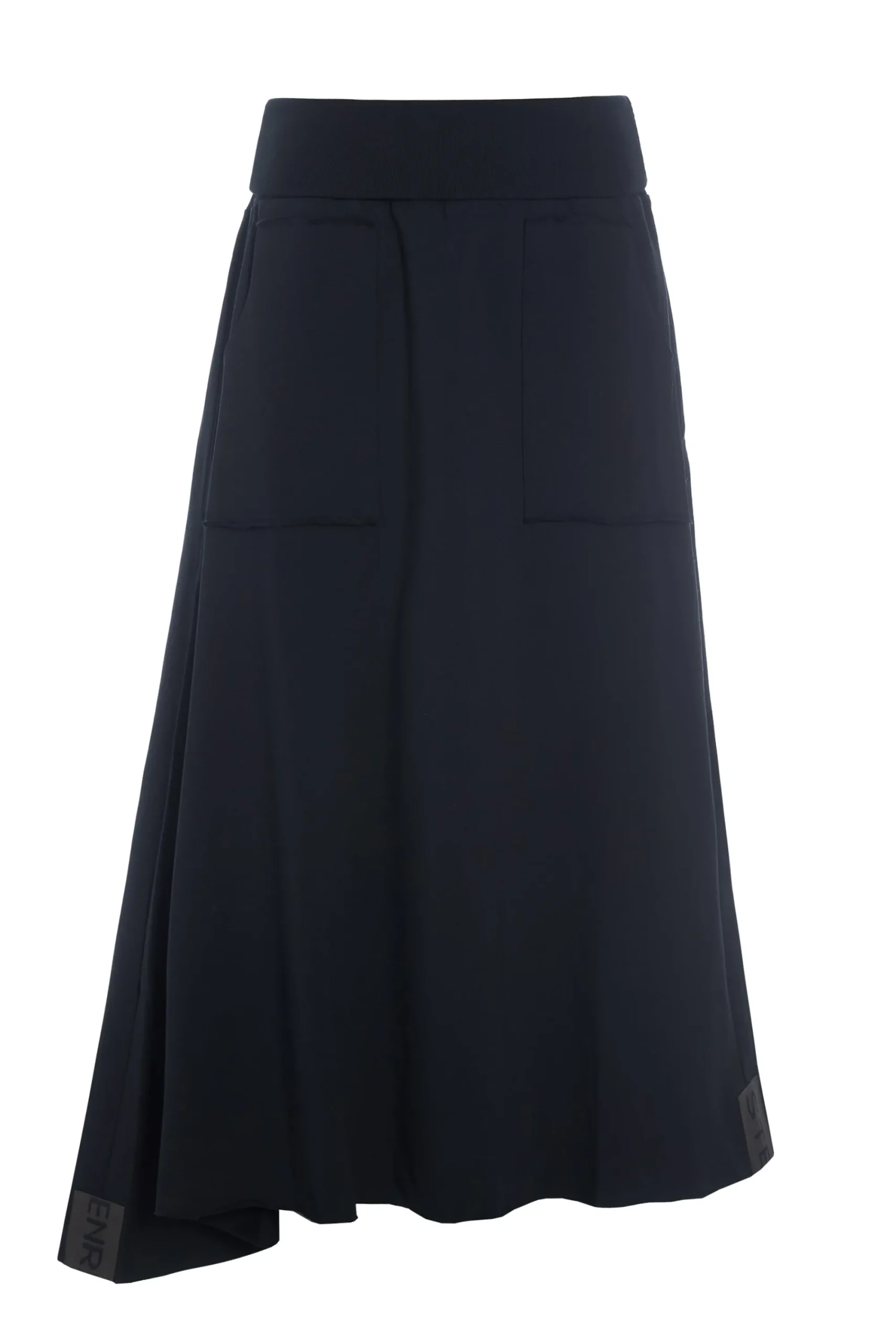 Lang nederdel med en høj talje lavet af dobbelt rib. Bær den højtaljet eller foldet ned. Nyd den brede A-form med asymmetrisk kant afrundet med logo-bånd i siderne. Nederdelen har lommer med rå kanter.