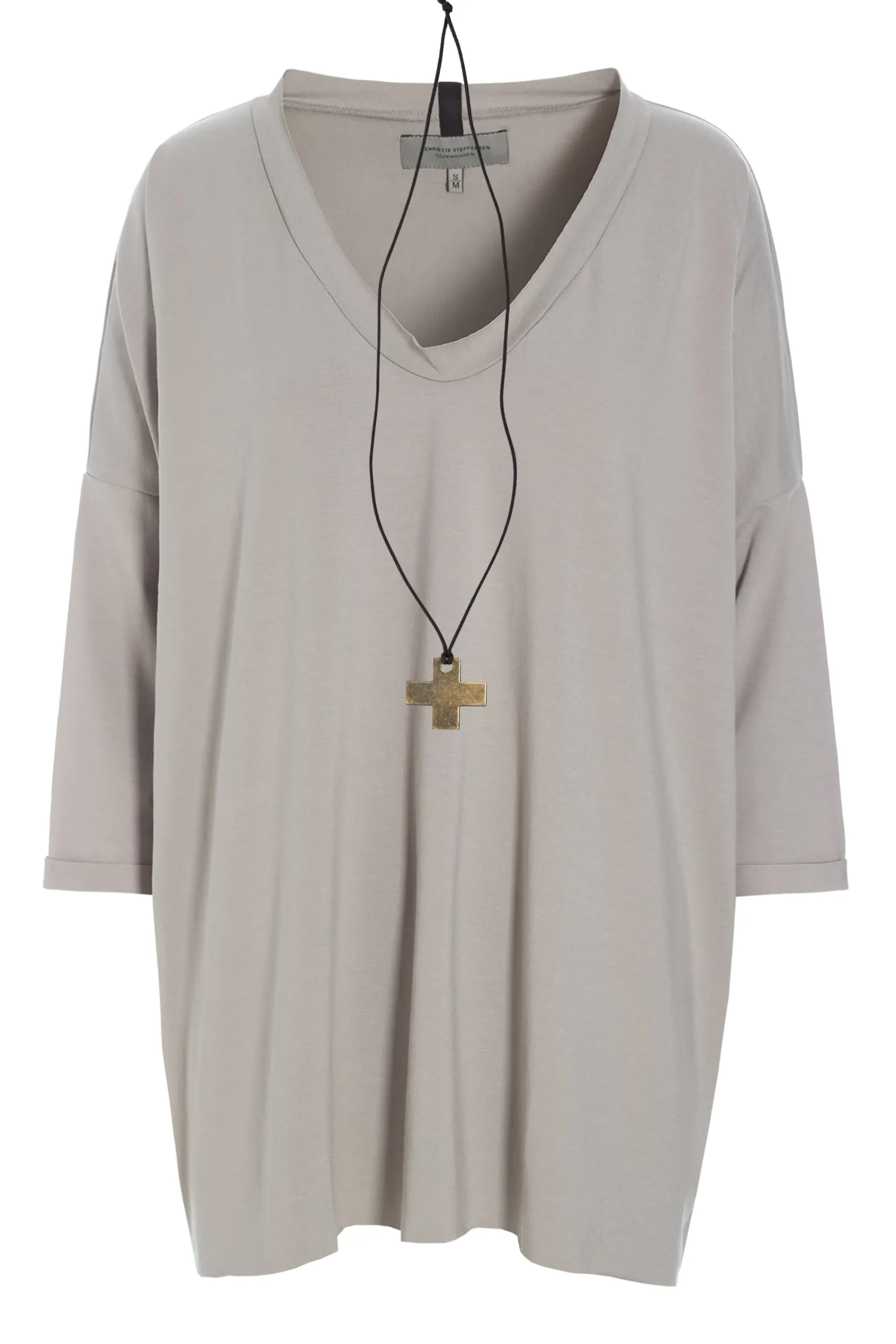 Blusen har et loose fit med trekvart lange ærmer og V-udskæring. Vores signatur kors smykke medfølger!