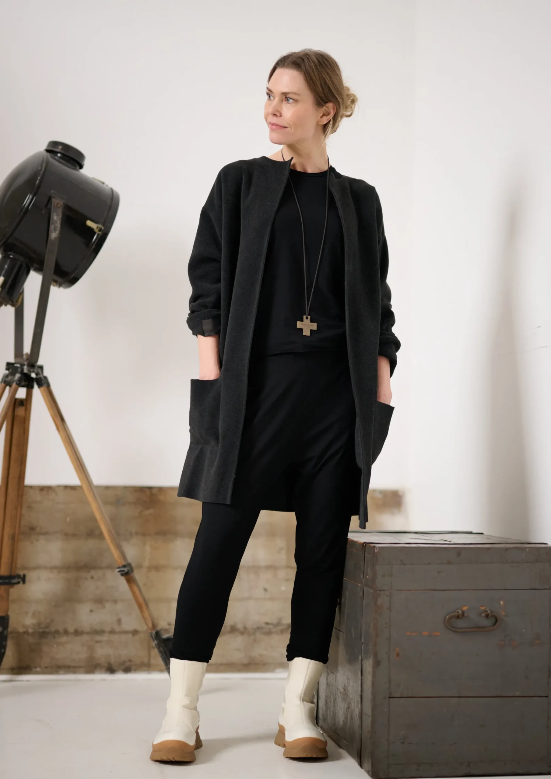 Klassisk cardigan med rund hals og lommer. Længde til midt på lårene. Vælg din normale størrelse.