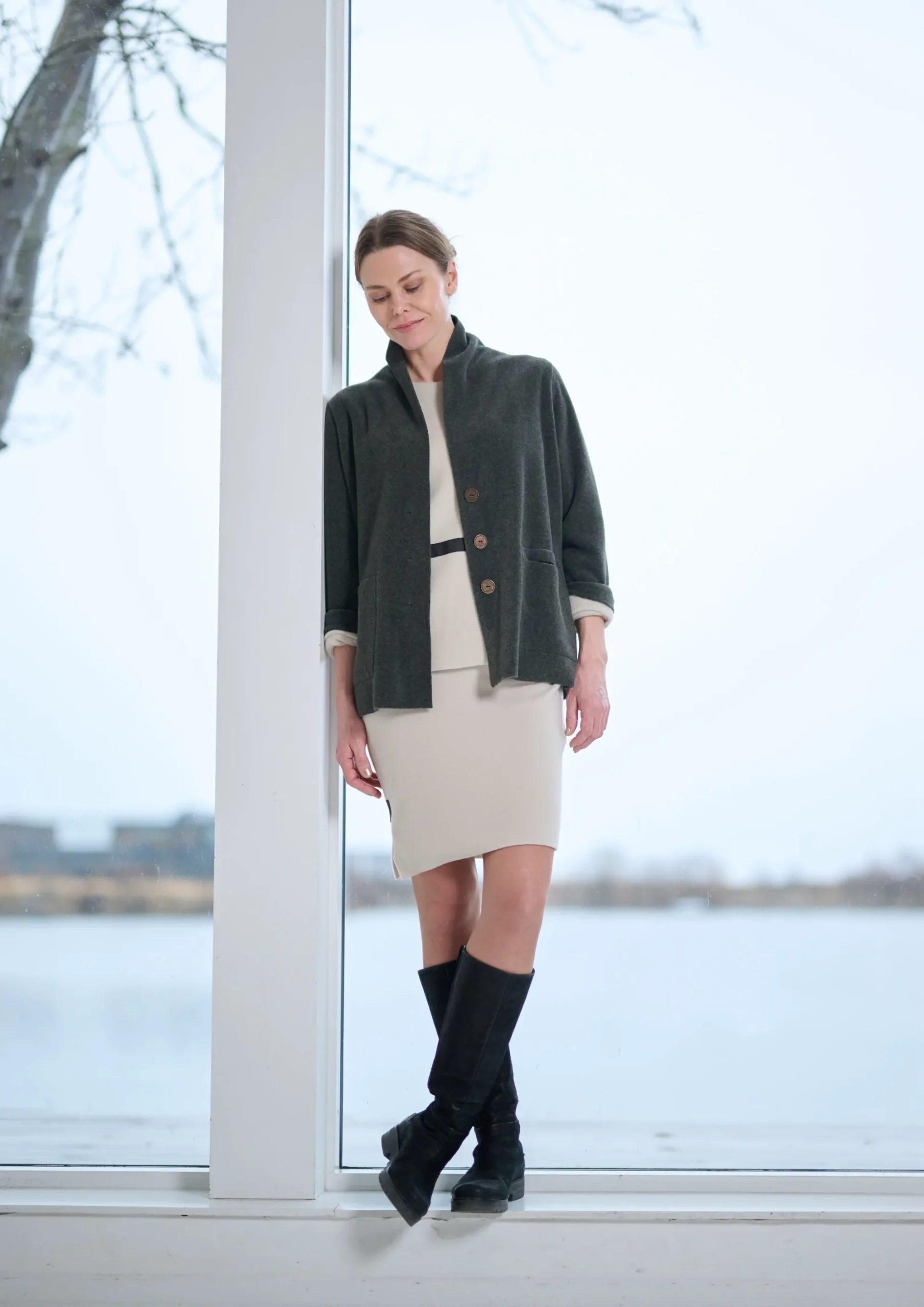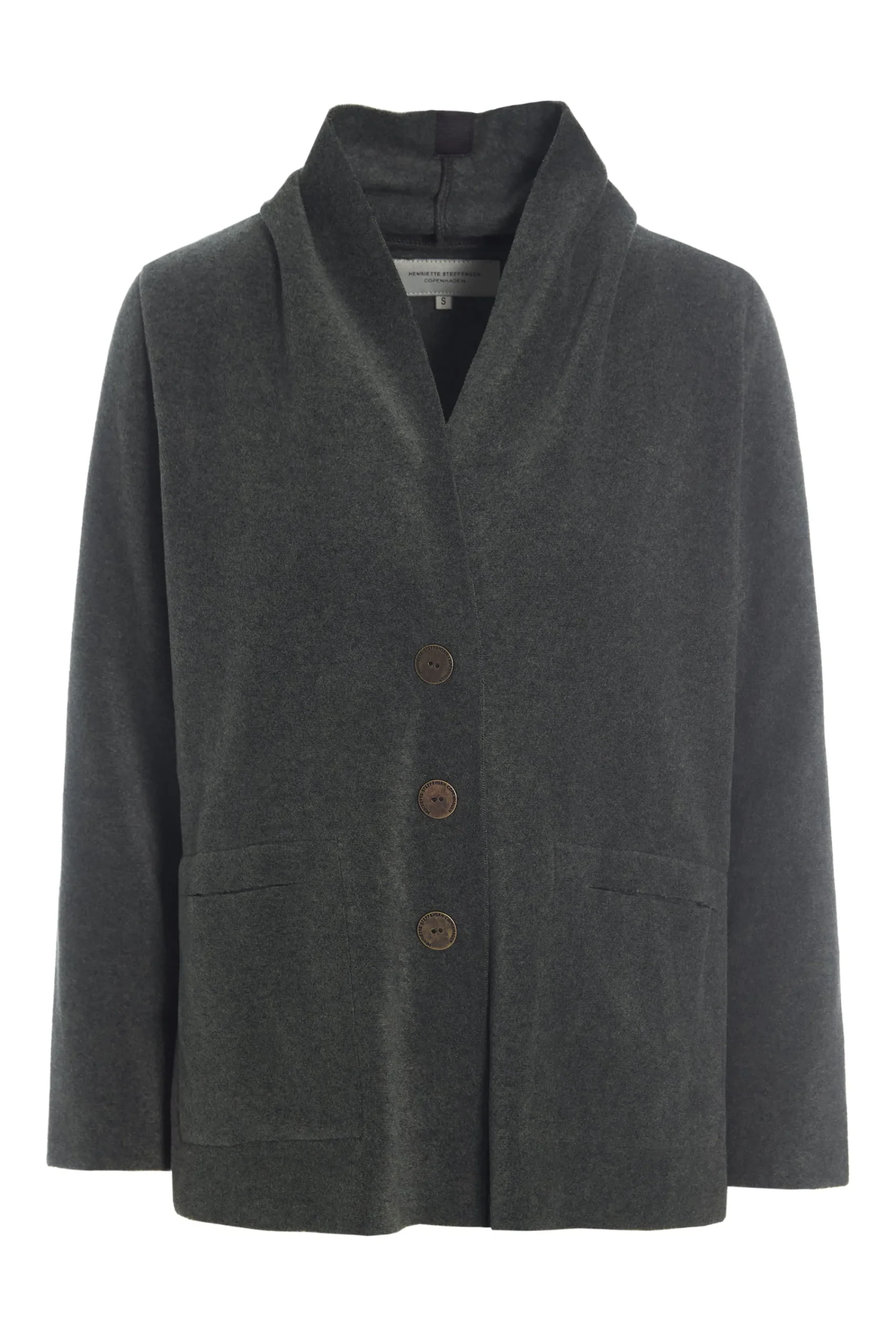 Kort cardigan med en krave, lommer og knaplukning. En kort version af bestselleren 7162. Vælg din normale størrelse som modellen, eller gå op i størrelse for en løsere pasform.