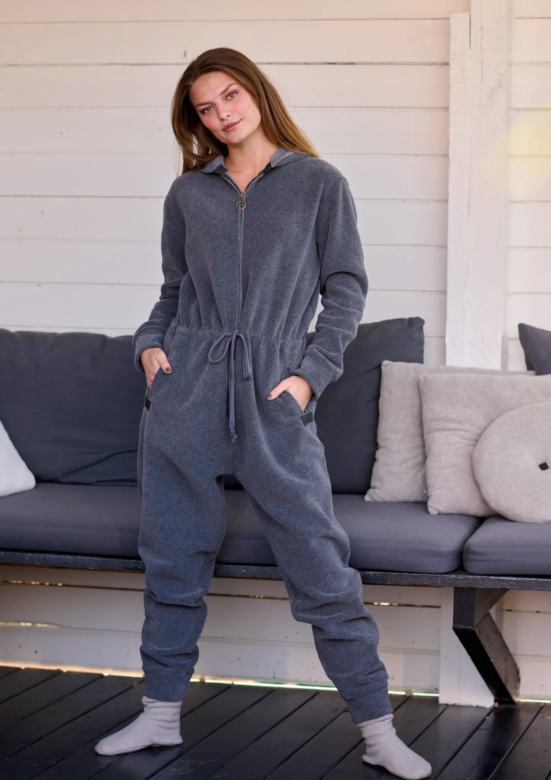 Rummelig og komfortabel jumpsuit med messing lynlås, bindebånd i taljen, hætte og lommer. Nyd den bløde følelse i denne heldragt. Perfekt at putte sig i efter en tur i det kolde hav!