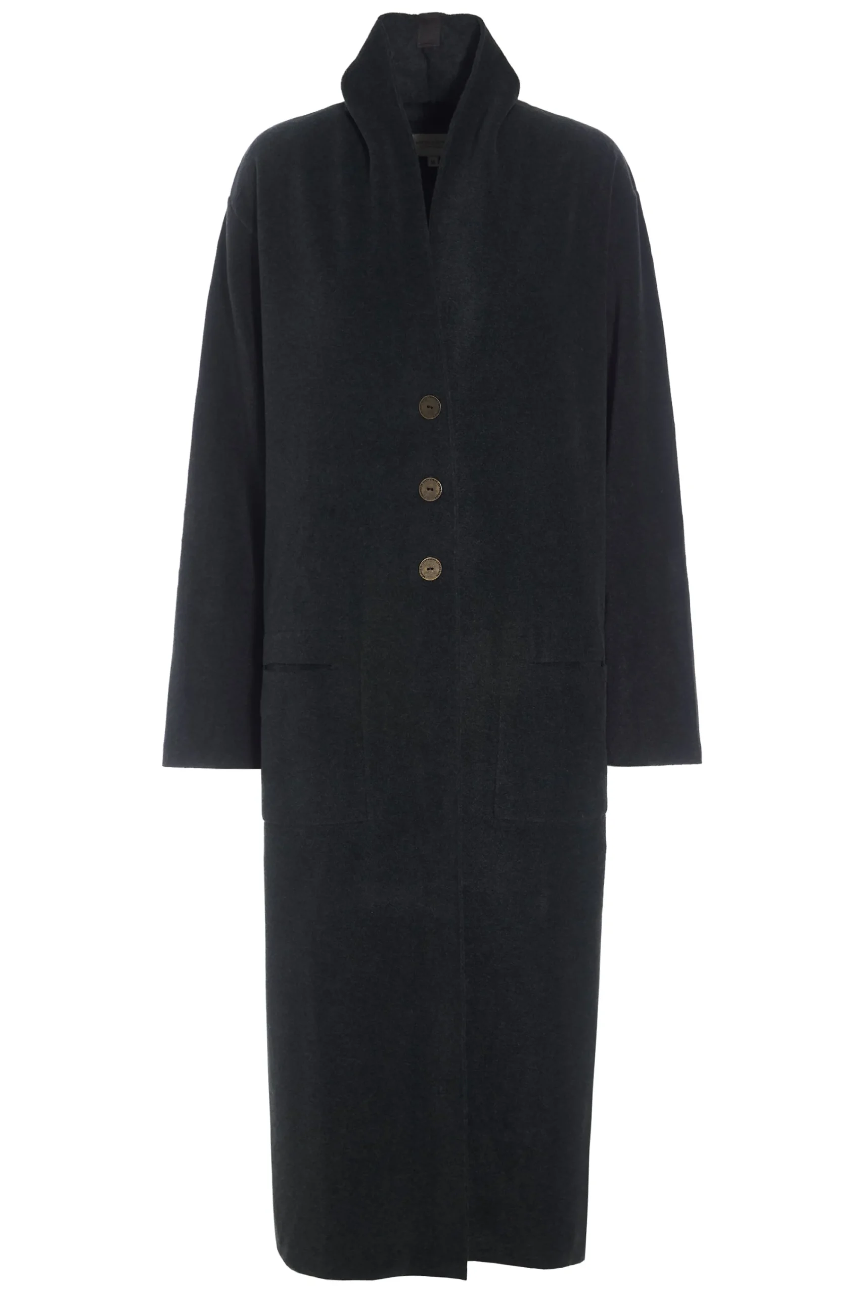 Lang cardigan med stor krave, lommer og tre messingknapper foran.