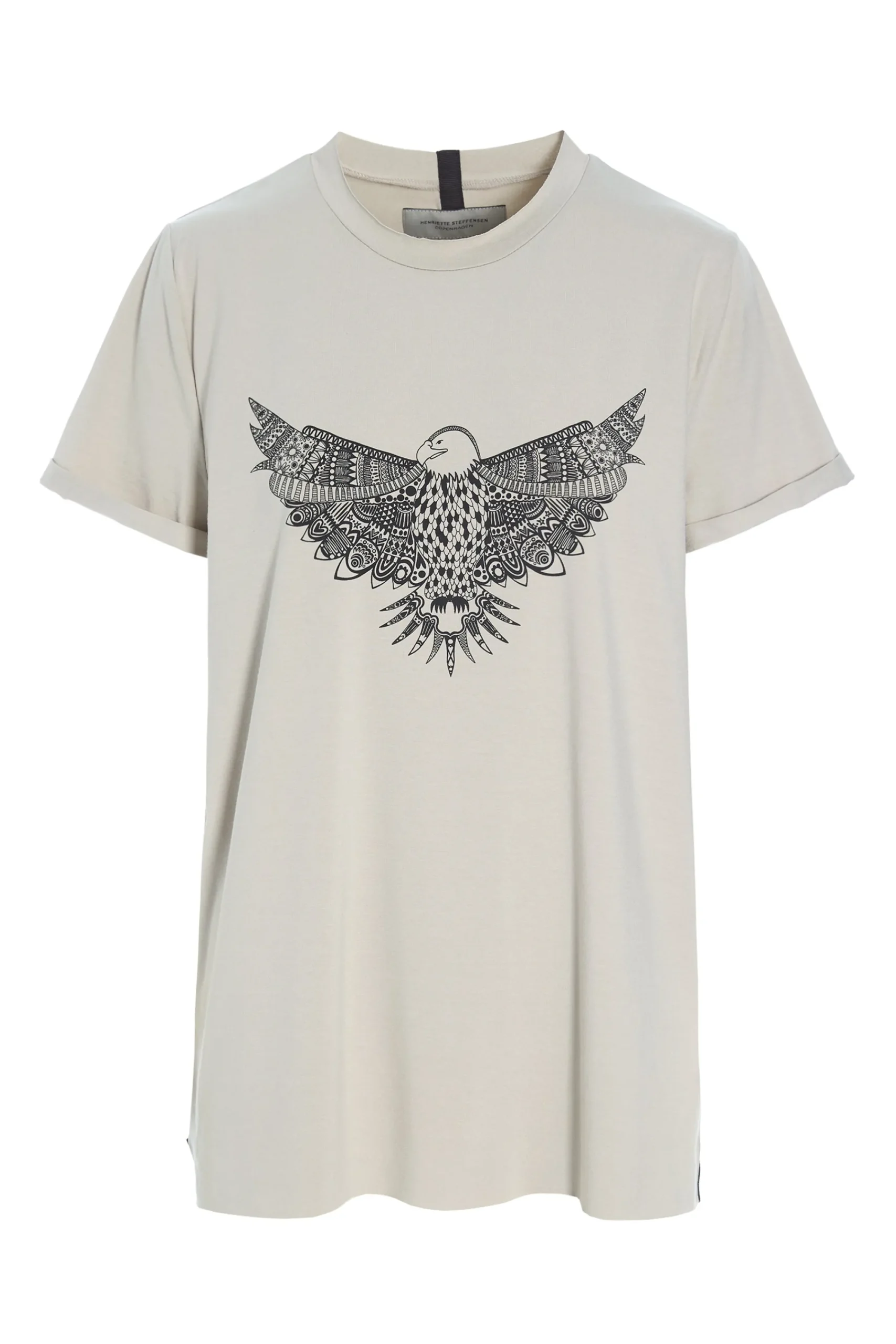 Onesize T-shirt med løs rund hals og ørne print. Denne style passer godt til M, L, XL – hvis du bruger XS -S og ønsker oversize, er den også perfekt! Brug den med jeans og blazer eller under din favorit fleece.