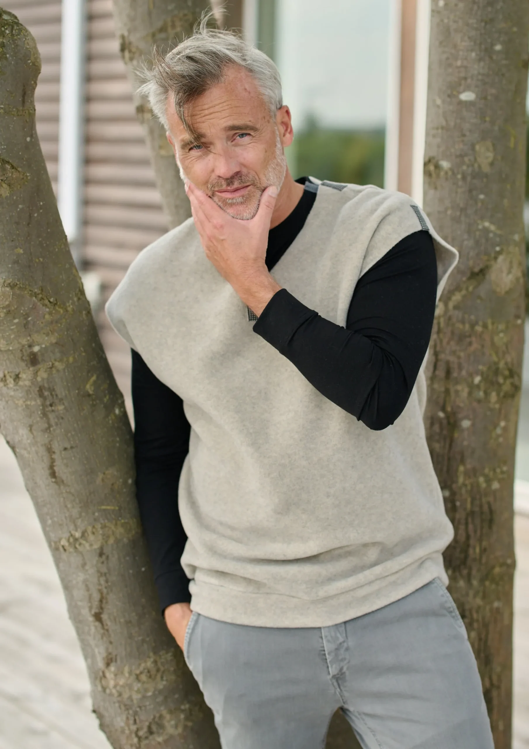 Denne klassiske, ærmeløse pullover har en V-udskæring, grosgrainbånd og en ribkant omkring taljen. Vores specielle kvalitet af fleecemateriale gør denne pullover blød, luftig og nem at rense.